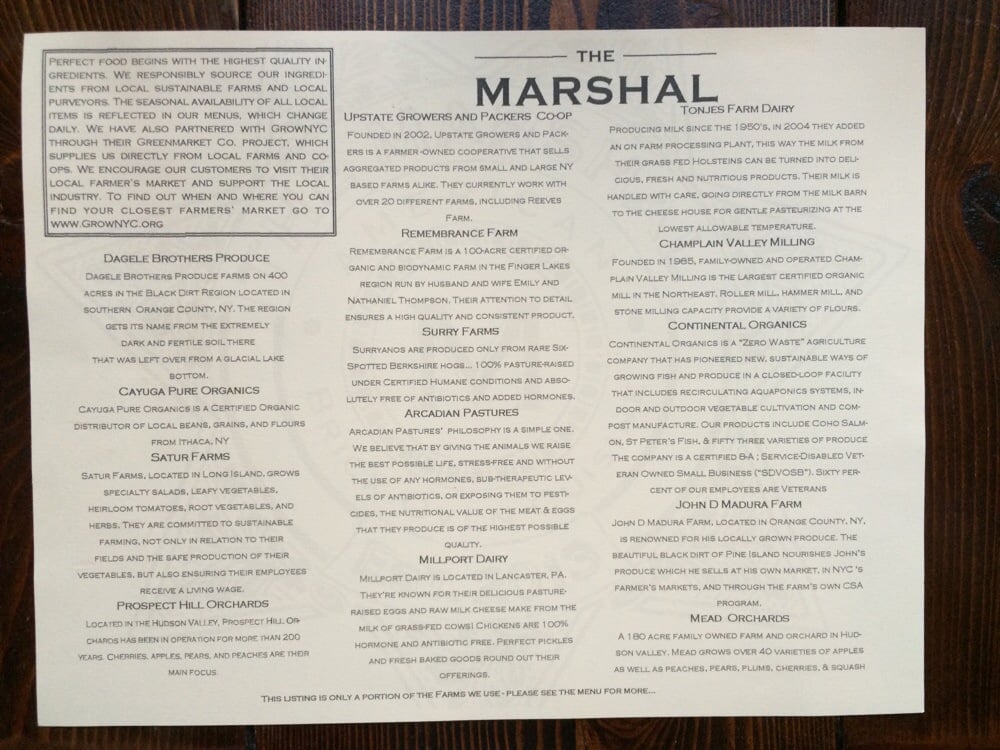 Introducing The Marshal, a charming American-Pizza- Breakfast & Brunch spot in New York City. This intimate restaurant offers a variety of vegan and vegetarian options, free Wi-Fi, a full bar, and even gender-neutral restrooms. The menu boasts dishes like peach summer pizza, heirloom tomatoes salad, and deviled eggs, all prepared with fresh and flavorful ingredients. The ambience is cozy and welcoming, reminiscent of a visit to grandma's house. Customers rave about the delicious food, exceptional service, and unique cocktails. From the harissa roasted cauliflower to the vegan pizza, every dish showcases the care and creativity put into the menu. Whether you're looking for a quick lunch or a special dinner celebration, The Marshal is a must-visit destination for food lovers.